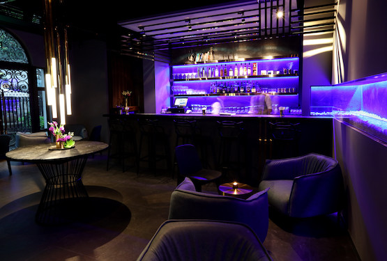 美食酒廊Opposite開在一幢修葺一新的兩層老洋房里,后面是一排高大上的豪華聯體公寓。它集各種截然不同的元素于一體:古典與現代、光明與黑暗、美食與酒飲。樓上的餐廳燈光閃耀,一樓的酒吧光線昏暗,籠罩著一種深沉的氣氛,這是在“向1930年代地下酒吧的低調風格致敬”。