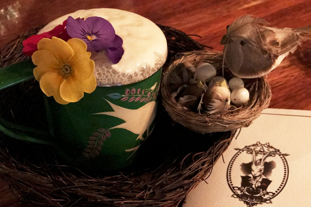 它是如何調制的?酒單上的配方里寫到了羅勒葉浸漬的必富達金酒、菠蘿蜂蜜和IPA泡沫,不過調酒師告訴我里面還用到了檸檬汁。Alice酒吧的雞尾酒出名的地方在它的裝飾,這杯也不例外。可食用花(靈感來自 Marian Beke掌舵Nightjar期間的創意 ),還有裝在“鳥巢”里的巧克力蛋(有著可口糖衣的那種)完整呈現了Birds and Bees所要表達的主題。
