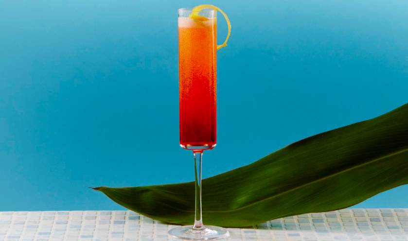 將Aperol和玫瑰花瓣糖漿倒入搖壺中,加冰搖勻后倒入香檳杯中,澆上起泡酒,用檸檬皮做裝飾。